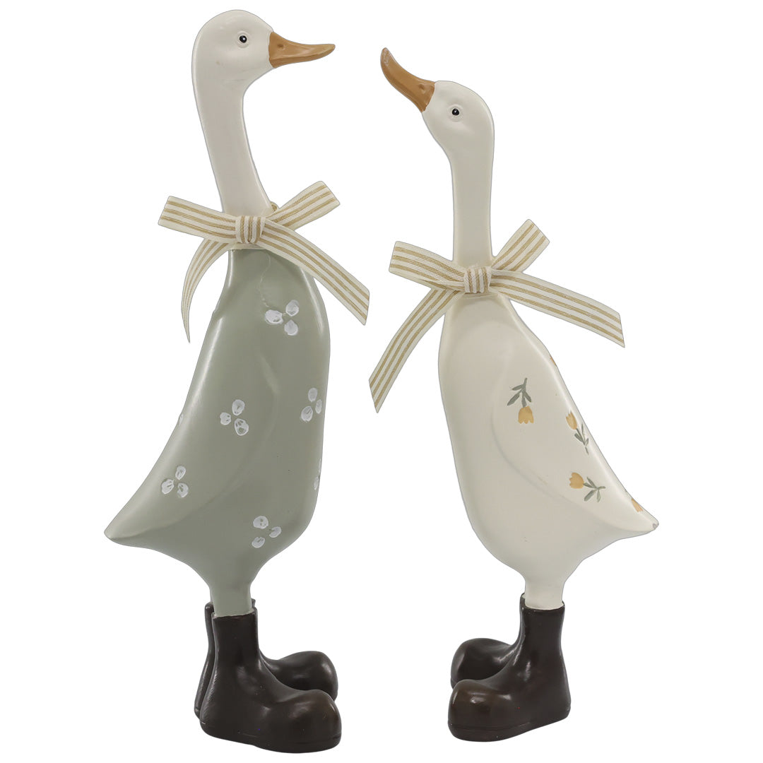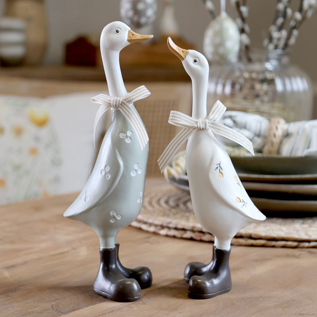 Dette sæt består af 2 dekorative gæs, håndmalet med stor sans for detaljer. De fine sløjfer tilfører et charmerende og hyggeligt udtryk, der gør figurerne til et populært valg til påske og forår. Fremstillet i slidstærk polyresin med tekstilsløjfer i polyester.