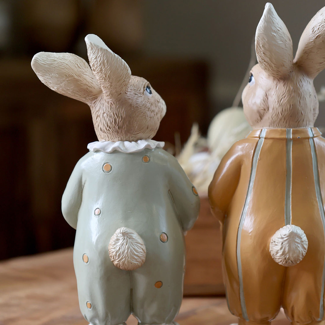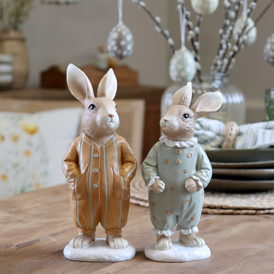 Disse dekorative påskekaniner er udført i polyresin og håndmalet, hvilket giver hver figur et unikt og levende udtryk. Pyjamasserne i bløde opal- og hazelnuancer understreger det rolige, nordiske look og gør figurerne nemme at kombinere med anden påskepynt. Et oplagt valg til dig, der søger stilfuld og stemningsfuld påskedekoration.
