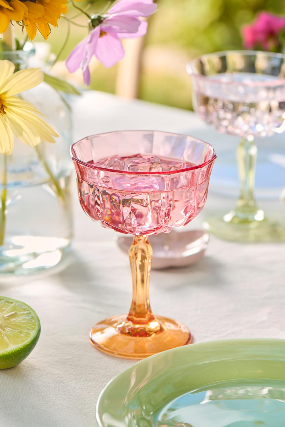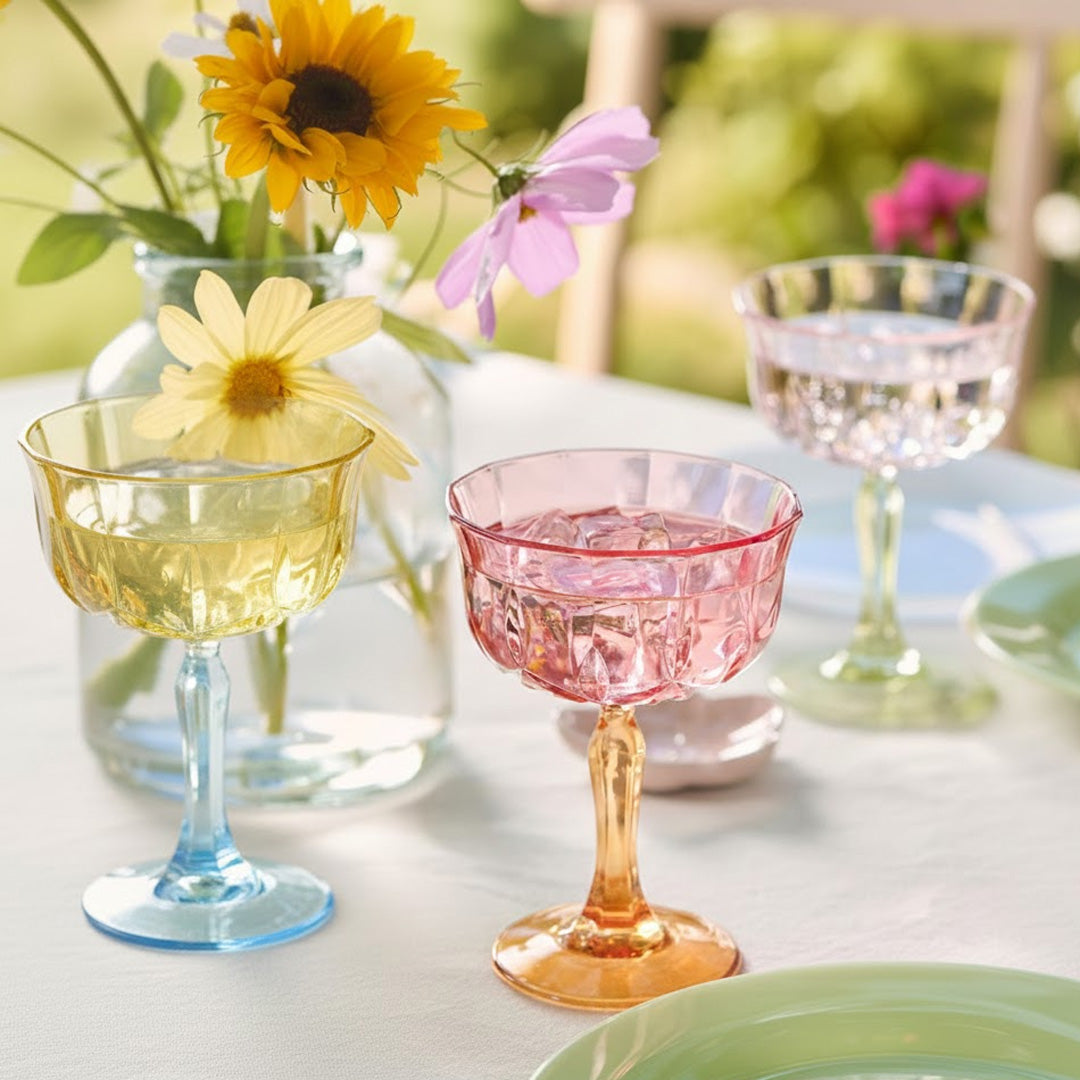 Vinglas i farvet glas med smuk facettering og let fod. Glassenes farver skaber variation og blikfang, mens størrelsen gør dem velegnede til vin og andre drikke. Håndvask anbefales for at bevare farvernes finish.