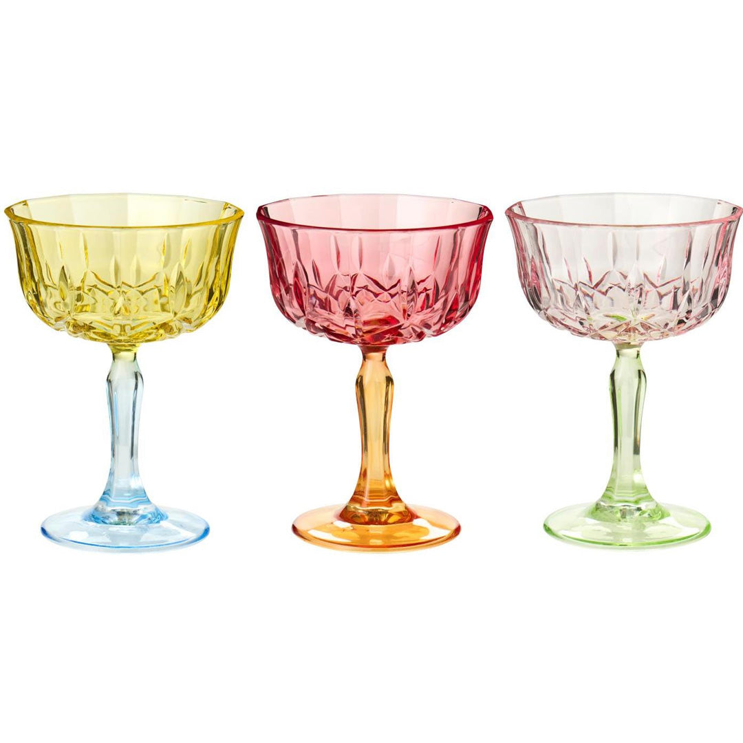 Sæt med 3 vinglas i forskellige farver: gul, rosa og grøn