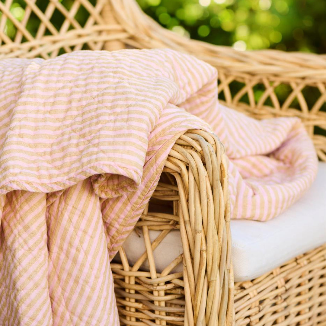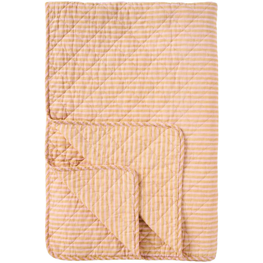 Blød og indbydende quilt med smalle striber i mustard og lyserød, der tilfører varme og farve til indretningen. Quilten er ideel som let tæppe på kølige aftener, som ekstra lag på sengen eller som et dekorativt element i sofaen. Den bløde bomuldskvalitet gør den behagelig i brug og velegnet til både hverdag og hygge.