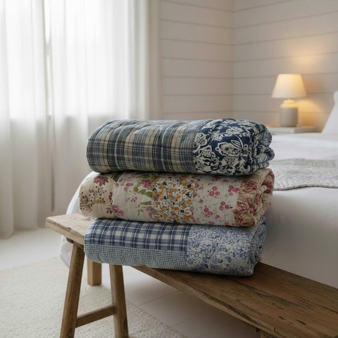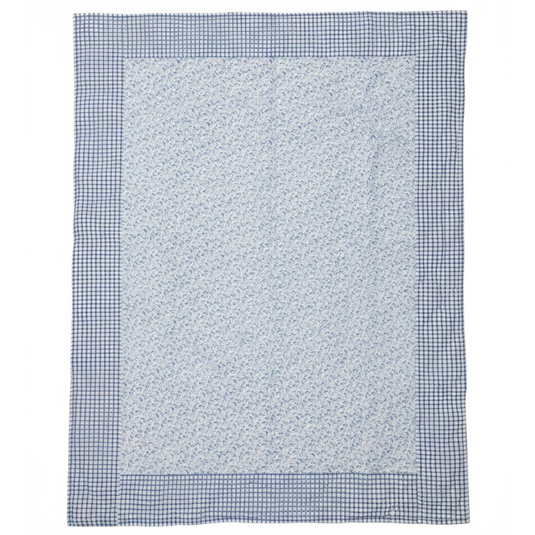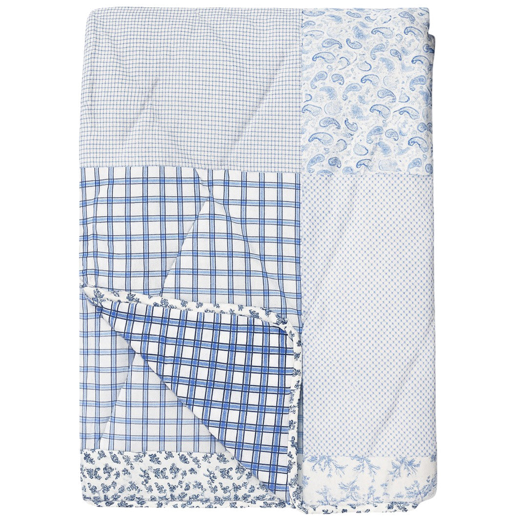 Patchwork Håndquiltet Vattæppe i Blå kombinerer rolige blå nuancer, fine blomsterprint og klassiske tern i et elegant og tidløst patchworkdesign. Fremstillet af 100% bomuld med fyld af 100% polyester, giver vattæppet en behagelig, let varme og en blød, luksuriøs fornemmelse.
