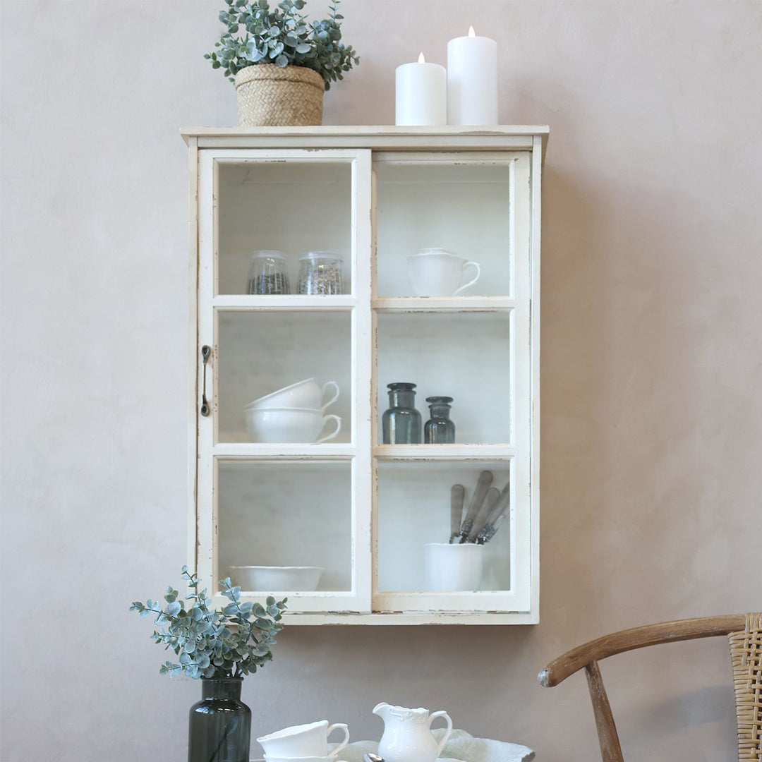Dette smukke Chic Antique skab til væg med skydedøre i antique creme er den ideelle kombination af vintage charme og praktisk opbevaring. Lavet af robust grantræ og krydsfiner med glasdetaljer og jernramme, passer det perfekt til både klassiske og moderne hjem. Skabet er designet til at skabe en stilfuld og funktionel opbevaringsløsning, uanset om det bruges i køkkenet, stuen eller entréen.