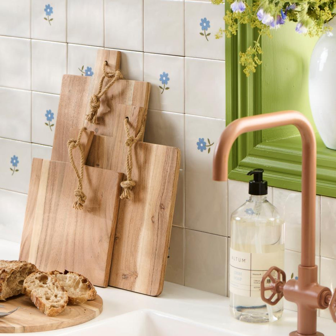 Skaftet og juterebet gør brættet nemt at håndtere og dekorativt at hænge op i køkkenet, når det ikke er i brug.