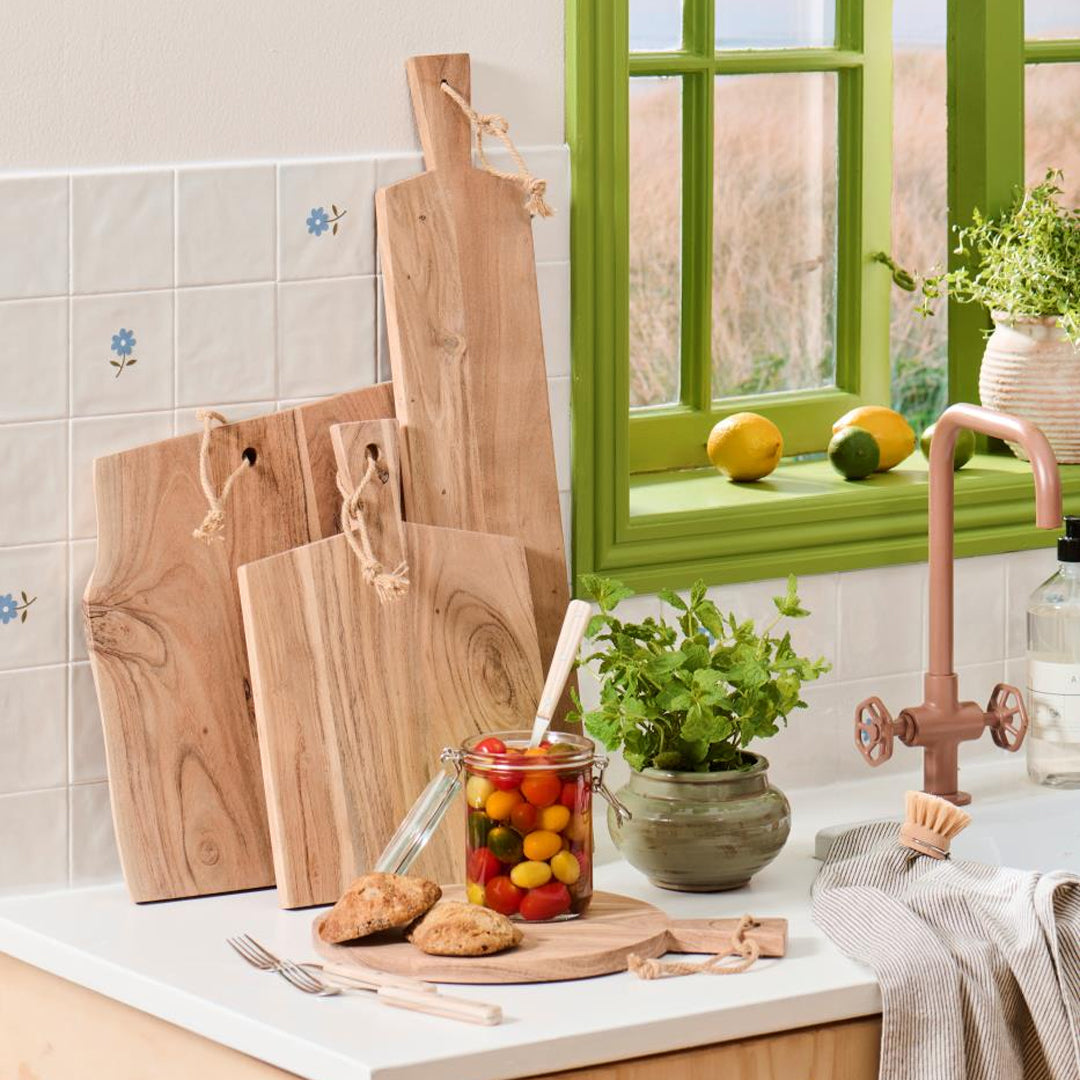 Giv dit køkken et naturligt og personligt præg med dette smukke skærebræt i akacietræ. Brættet har en firkantet form med uens, naturlige kanter, hvilket gør hvert enkelt bræt til et UNIKA med sin egen karakter og åretegning.