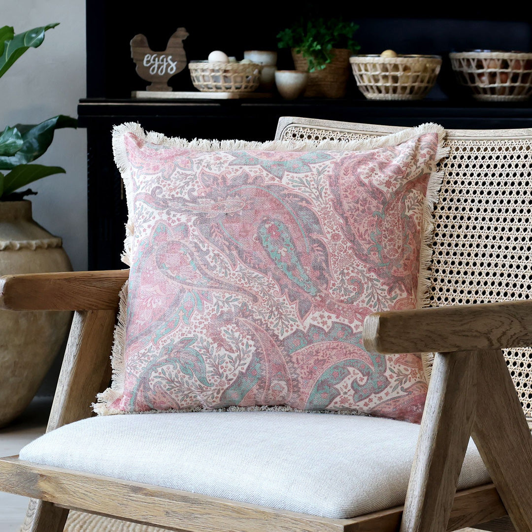 Giv din indretning et strejf af elegance med dette dekorative pudebetræk i bløde nuancer af raspberry og rosa. Det klassiske paisleymønster tilføjer et raffineret og tidløst udtryk, mens frynserne langs kanten giver et afslappet og eksklusivt finish.
