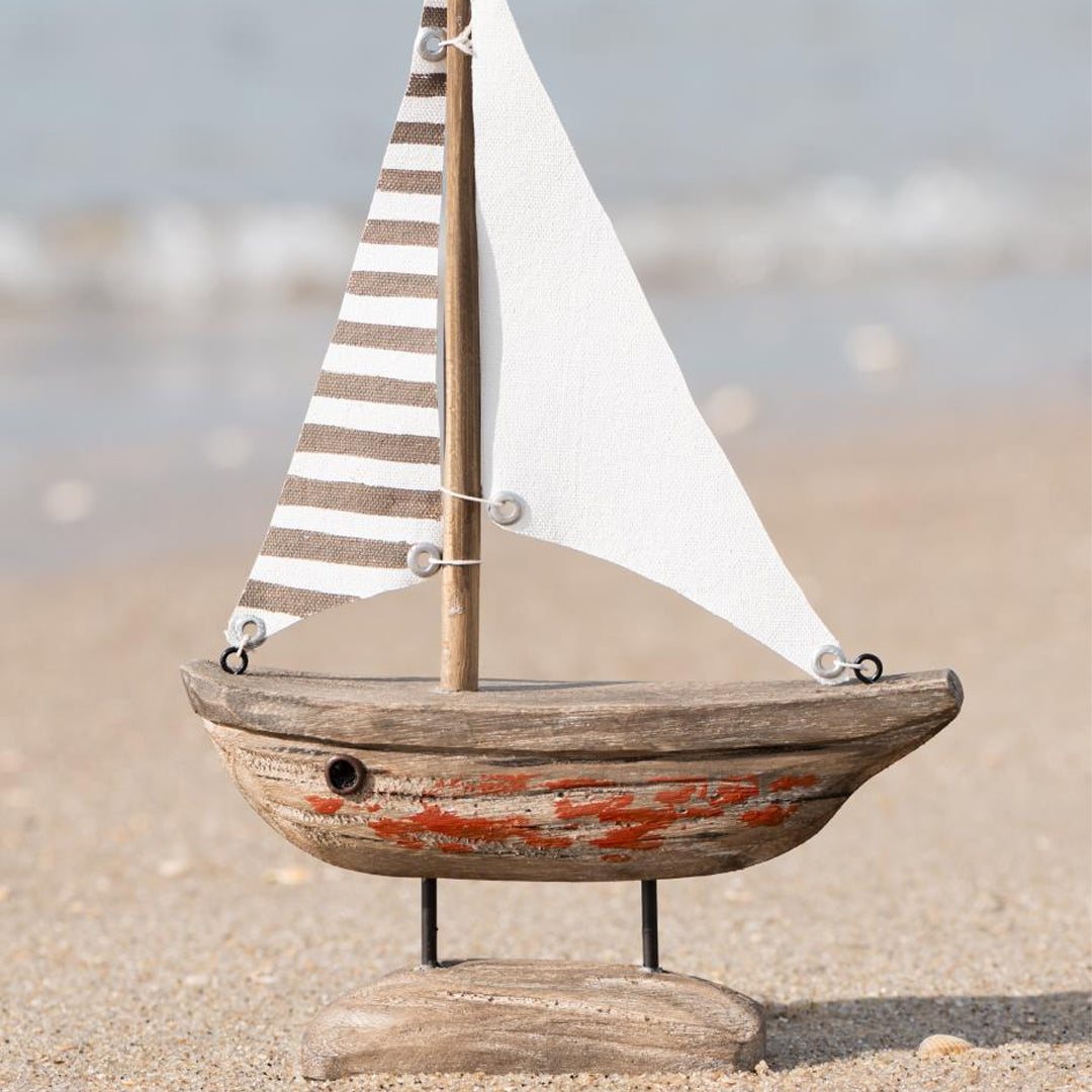 Bring kystlivet indenfor med dette håndlavede træskib fra Nautico. Skibet kombinerer et rustikt udtryk med fine maritime detaljer som det hvid- og stribede sejl og det karakteristiske røde skrog. Et stemningsfuldt dekorationsobjekt, der skaber associationer til hav, strand og sommer.