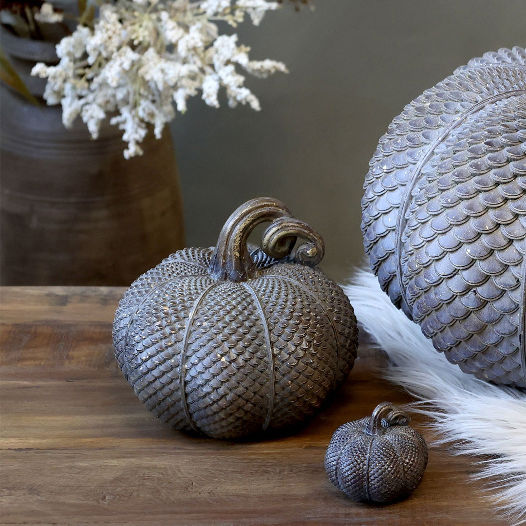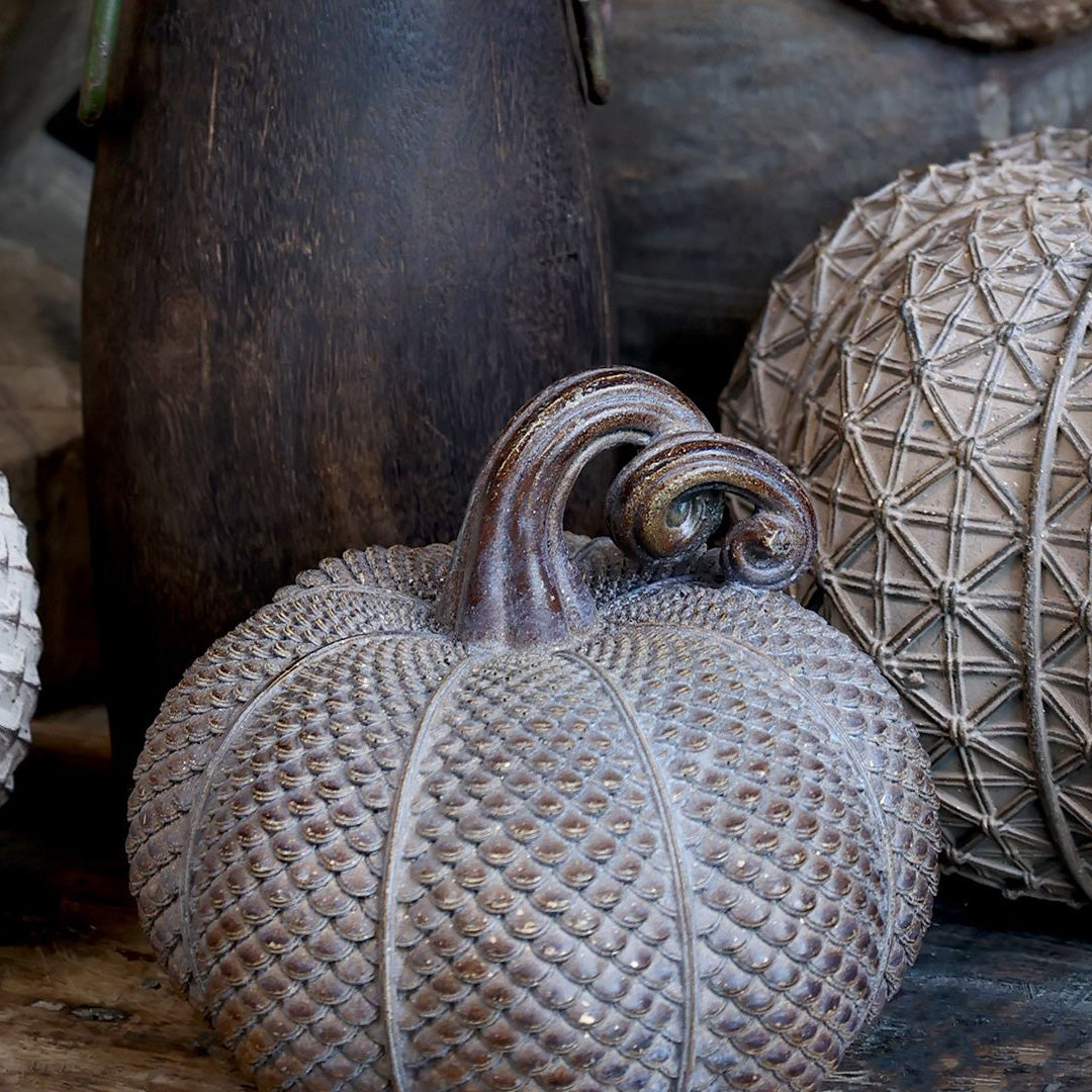 Tilfør varme og elegance til din efterårsdekoration med dette smukke græskar med gulddetalje fra Chic Antique. Udført i slidstærkt polyresin og malet i en stemningsfuld antique mocca-finish, er det en tidløs pynt til både hjem og have.