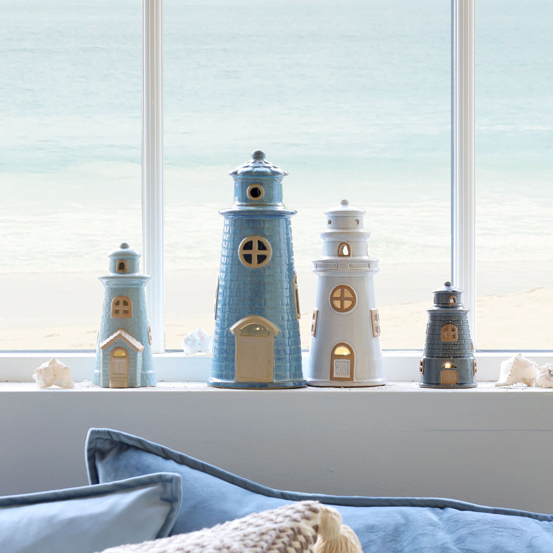 Dette dekorative fyrtårn med LED i den lyse nuance sky blue tilfører et let og maritimt udtryk til indretningen. Det bløde LED-lys skaber en hyggelig stemning og giver følelsen af kyst og sommer – perfekt til både sommerhus og hjem.