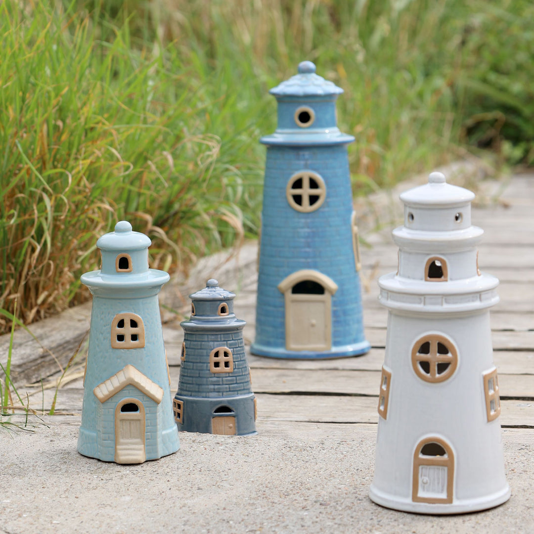 Fyrtårnet er fremstillet i keramik og håndmalet, hvilket gør hvert enkelt fyrtårn unikt. Små uregelmæssigheder i glasuren kan forekomme og er en naturlig del af det håndlavede design. Den integrerede ON/OFF-knap gør det nemt at betjene lyset, mens den større størrelse gør fyrtårnet ideelt som et dekorativt statement i hjemmet.