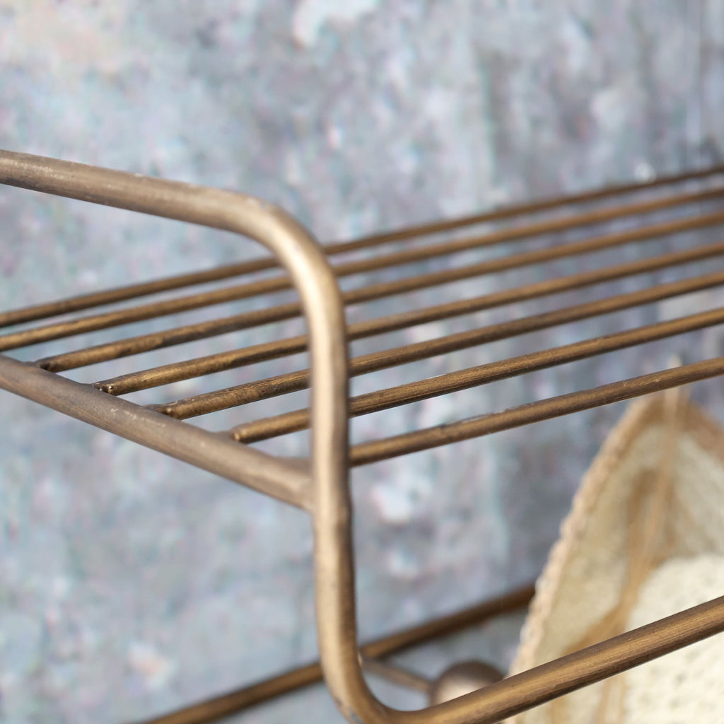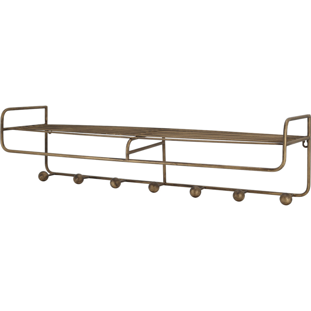 Praktisk og dekorativ hylde i jern med syv knager, der kombinerer opbevaring og ophæng i ét funktionelt design. Den antik messingfarvede finish giver hylden et klassisk og tidløst udtryk, som passer perfekt til entré, køkken eller badeværelse. Ideel til overtøj, tasker, håndklæder eller viskestykker – med ekstra plads på hylden til kurve eller dekorationer.