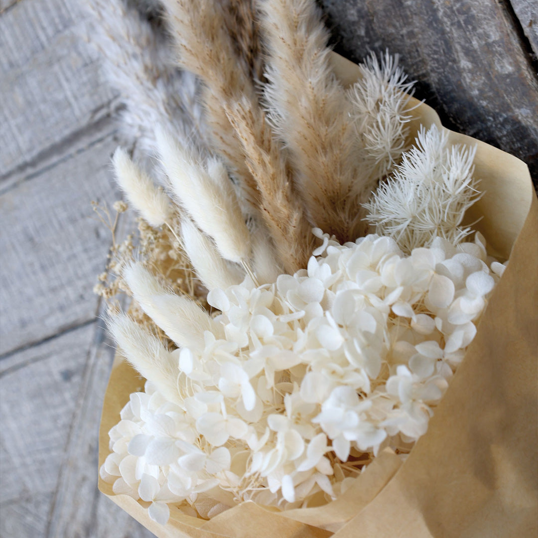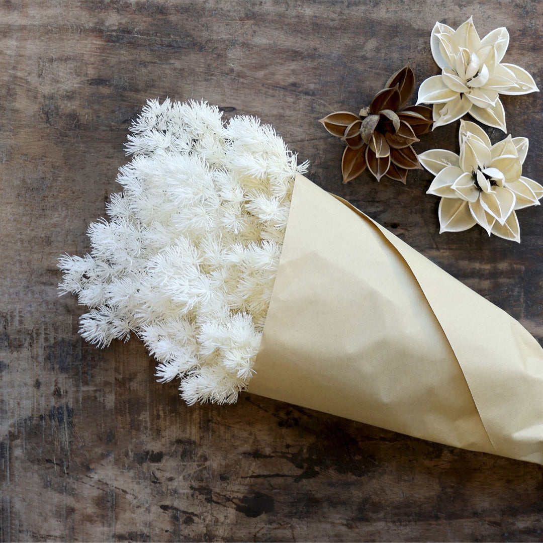Tilføj en let og romantisk stemning til dit hjem med denne smukke tørrede slørasparges-buket fra Chic Antique. De fine, cremefarvede grene er samlet i brunt papir og egner sig perfekt til både moderne og klassiske blomsterarrangementer.