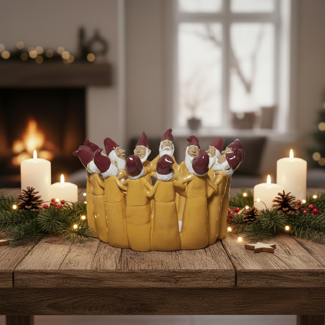 Skab en imponerende og stemningsfuld juledekoration med denne store nissering fra Harvesttime. De glade nisser i safrangule dragter og røde huer står skulder ved skulder og danner en festlig ring, der bliver et naturligt midtpunkt i hjemmets juleindretning. Den varme farvekombination giver en hyggelig og autentisk atmosfære, perfekt til både traditionel og moderne julepynt.