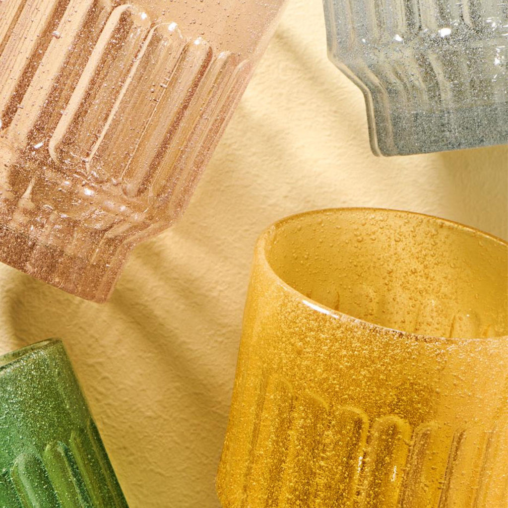 Tilføj farve, liv og personlighed til bordet med dette sæt drikkeglas i fire forskellige farver, hver med smukke dekorative bobler i glasset. De har en legende og håndlavet æstetik, som gør dem lige velegnede til hverdag og fest.