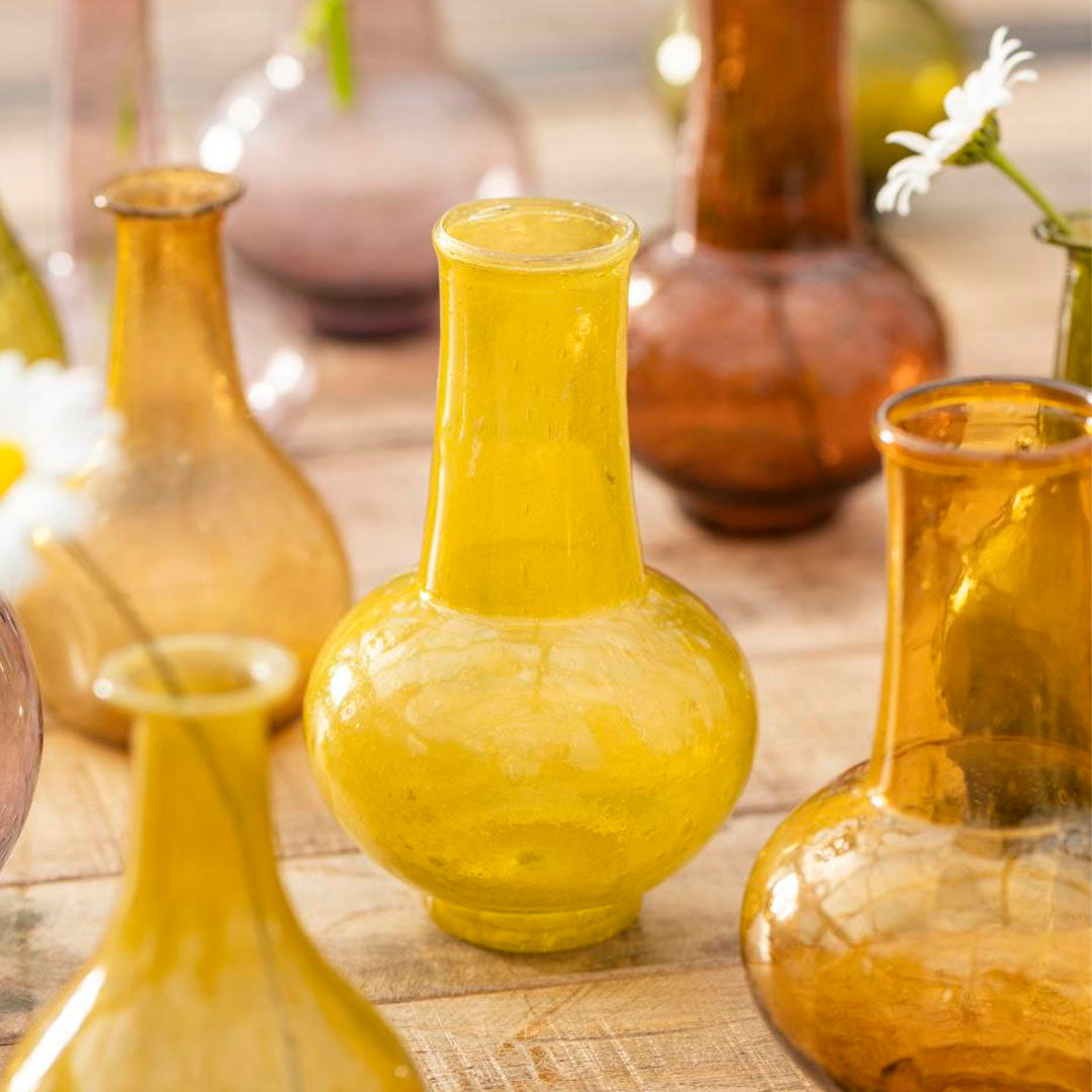 Bring farve og personlighed ind i dit hjem med dette charmerende sæt af 5 mundblæste vaser, hver i sin unikke farve. Vaserne er fremstillet af genbrugsglas og har en elegant, bred hals, der gør dem perfekte til en enkelt blomst – eller som dekorative elementer i sig selv.