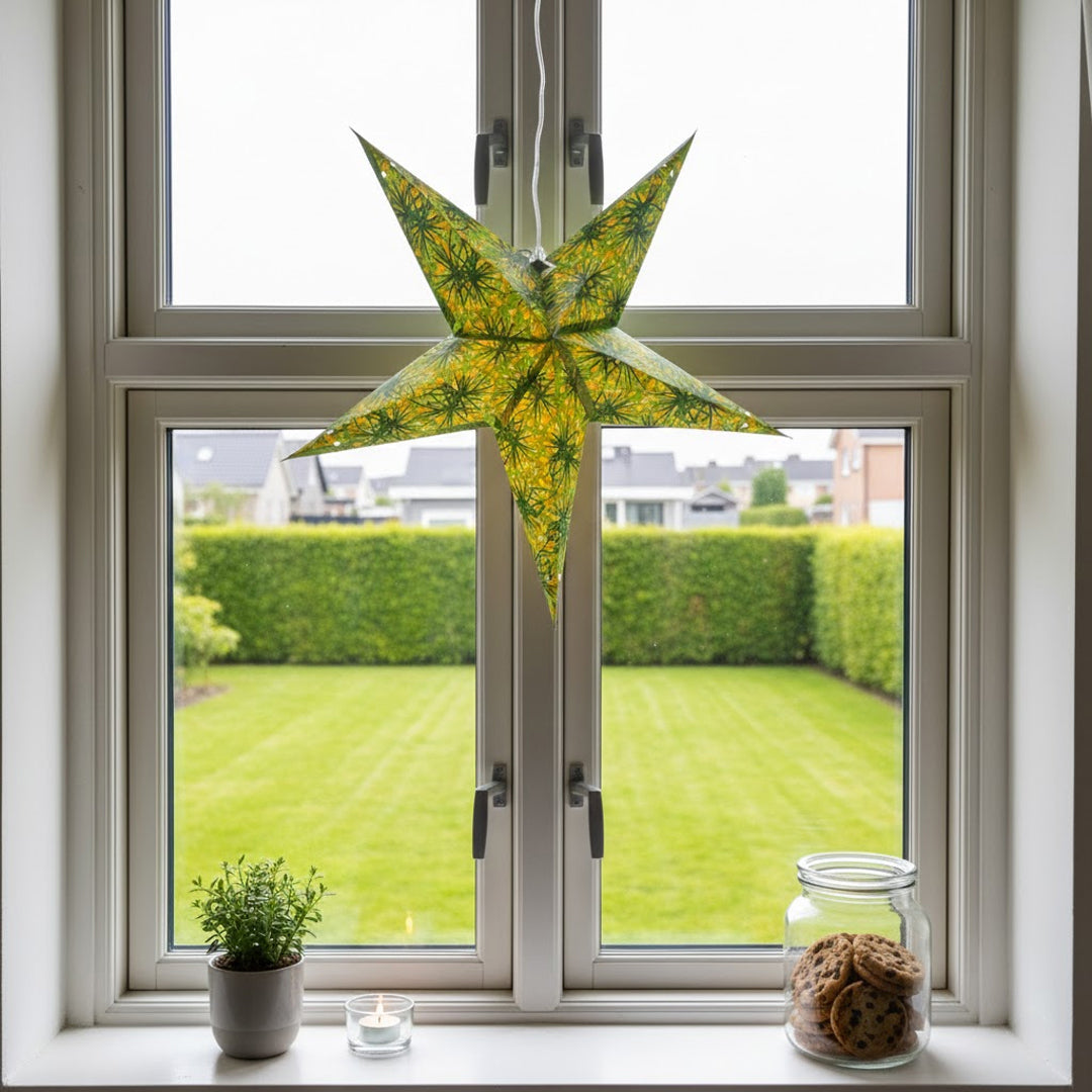 Bring farve, liv og naturens energi ind i hjemmet med Aranya Stjernelampe – en håndlavet 5-takket papirlampe i grønne og gule nuancer med et frodigt, næsten botanisk mønster. Når lampen tændes, træder farverne smukt frem og kaster et varmt, livligt lys i rummet.