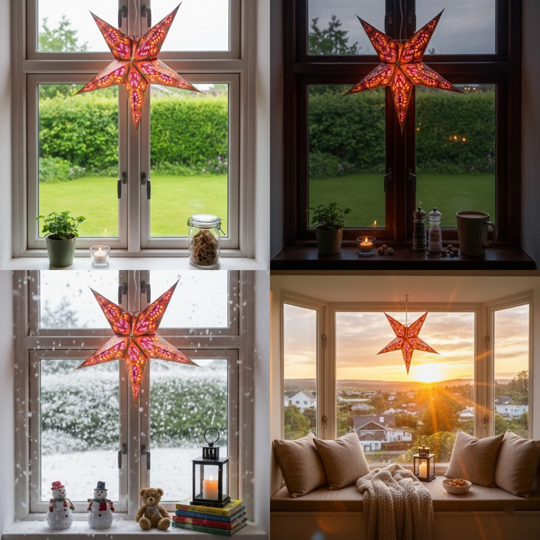Når lyset tændes, træder farverne frem i et varmt, glødende skær, der skaber en stemningsfuld atmosfære – perfekt til både fest, hygge og dekoration året rundt.
