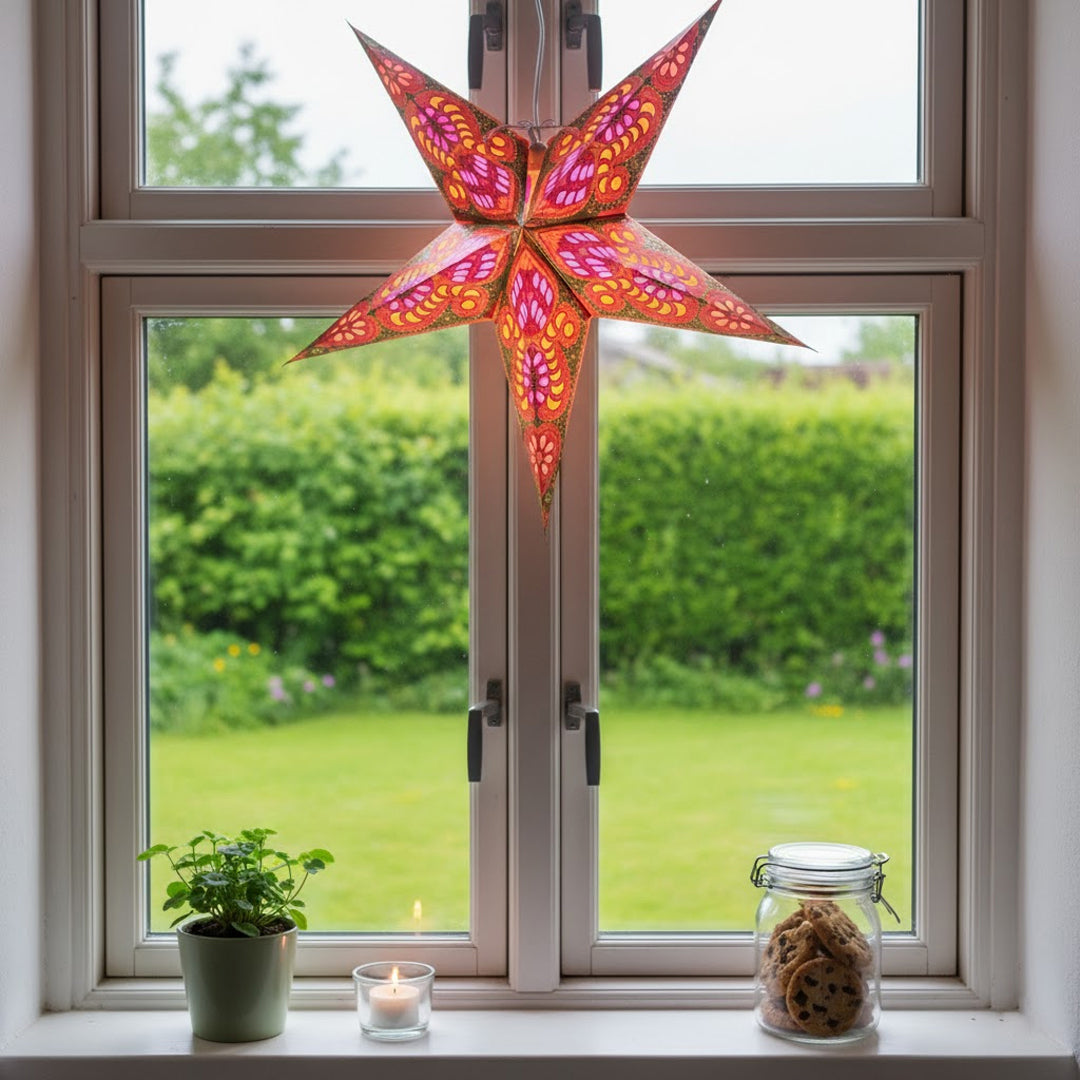 Fyld rummet med farve og varme med Meera Stjernelampe – en håndlavet 5-takket papirlampe med et levende mønster i rosa, orange, guld og sort. Det detaljerede design minder om indisk tekstilkunst og giver lampen et både elegant og kunstnerisk udtryk.