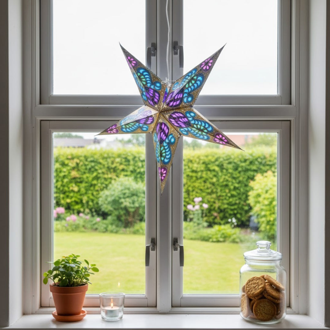 Lad lyset udfolde sig med Moonmind Tara Stjernelampe – en håndlavet 5-takket papirlampe, der kombinerer dybe blå, turkise og lilla nuancer på en mørk baggrund. Resultatet er et elegant, næsten kosmisk spil af farver, der kaster et roligt og stemningsfuldt lys ud i rummet.